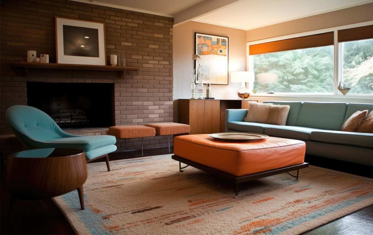 The low-slung, brown leather square coffee table serves as the focal point of this living space. Its understated authenticity complements the retro design of the area. The coffee table rests on a vibrant and vibrant area rug, adding character and charm to the otherwise muted surroundings. Its earthy brown hues merge seamlessly with the room’s uncomplicated décor, making it a valuable and stylish addition to the space.