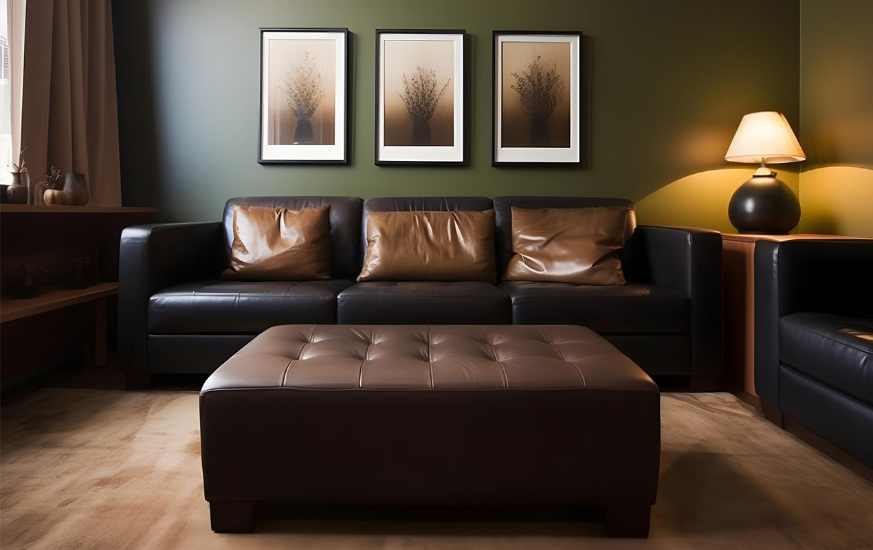 The centerpiece of this furniture setup is a round coffee table made of brown leather, creating an authentic vibe. The table’s hardwood legs are sturdy and exude refinement, while the warm and inviting leather upholstery makes it a homely addition. This piece pays homage to the timelessness of traditional aesthetics. Placed among upholstered furniture; the table adds to the decor while harmonizing with the surrounding ambiance of the room and thus creating a stylish and inviting setting.
