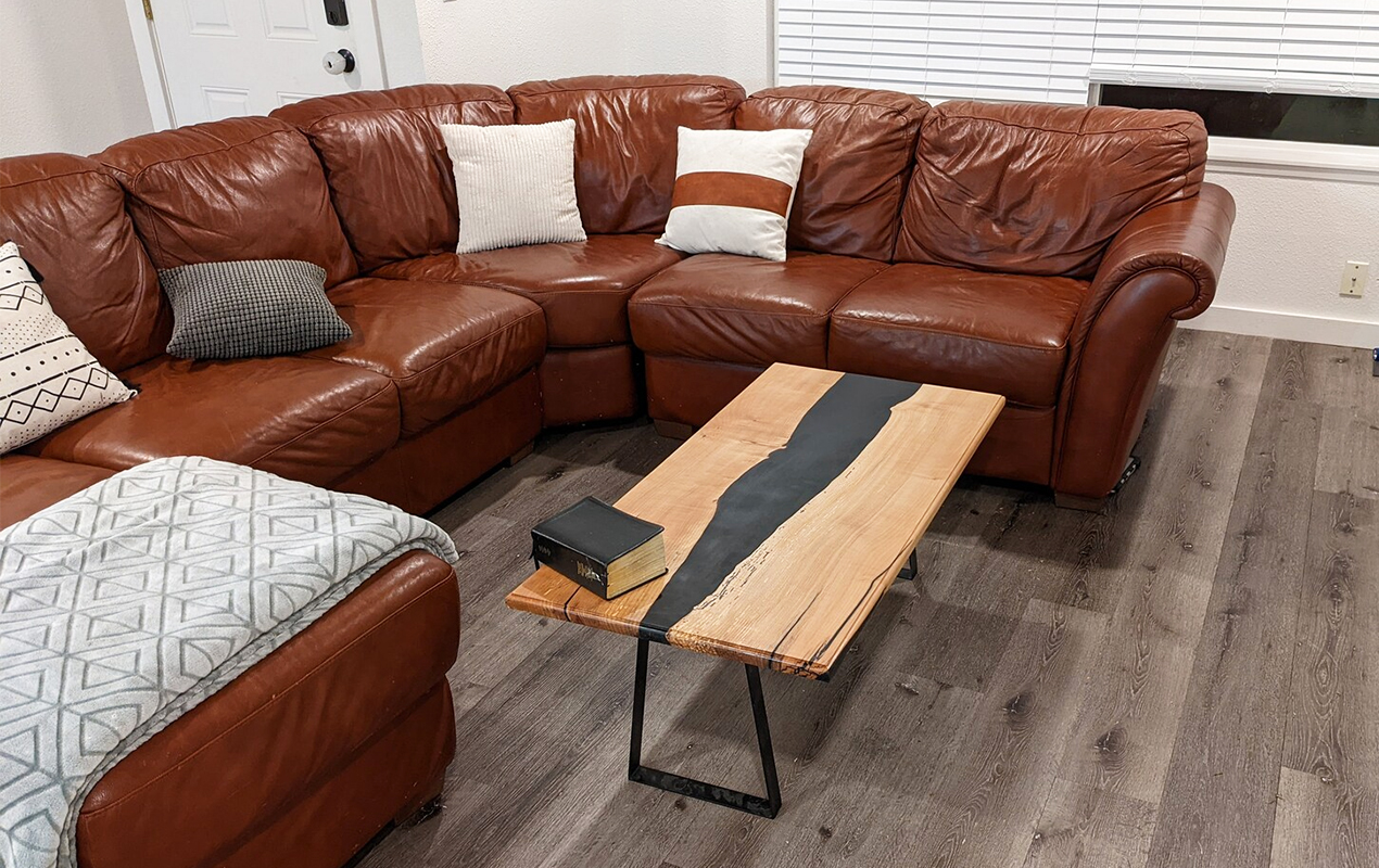 This coffee table brings a fusion of natural and modern elements. Its rectangular top showcases light hues and a dramatic black epoxy resin inlay. The spalting within the wood forges an organic feel while resting on the sleek trestle base, bolstering a contemporary vibe. The wood coffee table’s narrow design makes it adaptable, pairing with the plush, U-shaped leather sofa for contrast in textures. It’s also set against light wood flooring for a balanced and eclectic look. This DIY table is a testament to the power of mixing materials with modern design, resulting in a functional, visually compelling piece.