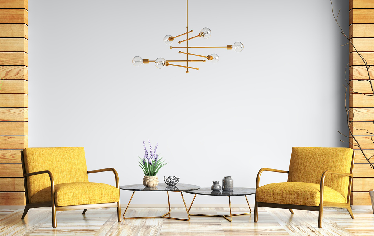 The minimalistic approach in this setup creates a bright and airy ambiance, combining light shades of blue and green. The shiplap flooring features a natural finish and serves as a sturdy foundation for the butcher-block marble coffee table with wooden-framed cross-back panels. Sparse twig decor and minimalistic ornaments are placed on the splashback top, complementing the side table’s plant decor.